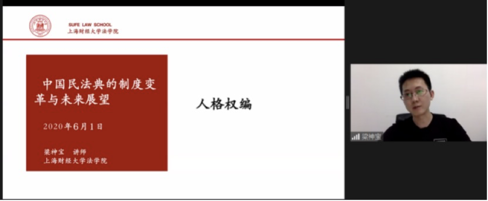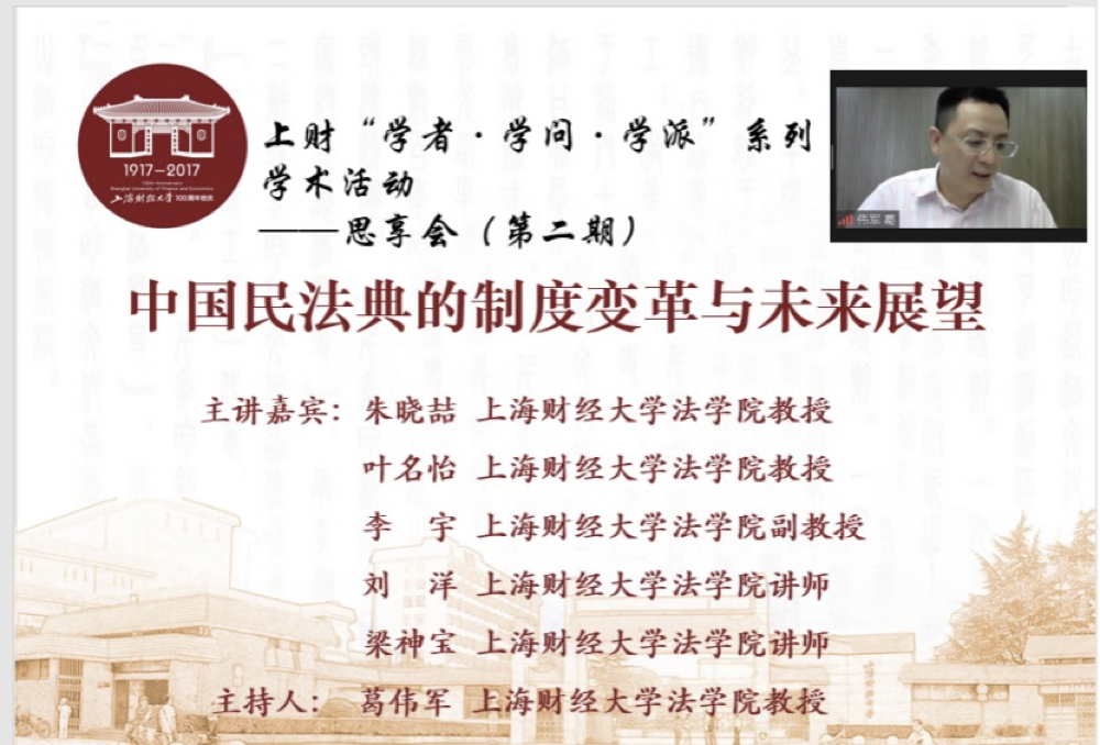 6月1日下午,由上海财经大学科研处主办的上财“学问·学者·学派”系列学术活动—思享会第二期以线上形式举办。本期“思享会”邀请到了我校法学院朱晓喆教授、叶名怡教授、李宇副教授、刘洋讲师和梁神宝讲师,围绕民法典的立法沿革及制度创新作了探讨汇报。论坛主持人由beplay全站 副院长葛伟军教授担任。“宅”家不停学、在线“云”课堂,本期“思享会”吸引了四百余位校内外师生共同参与,新形势、新思路、新技术,打破了全校师生足不出户便能与校内专家学者即时互动的新局面。