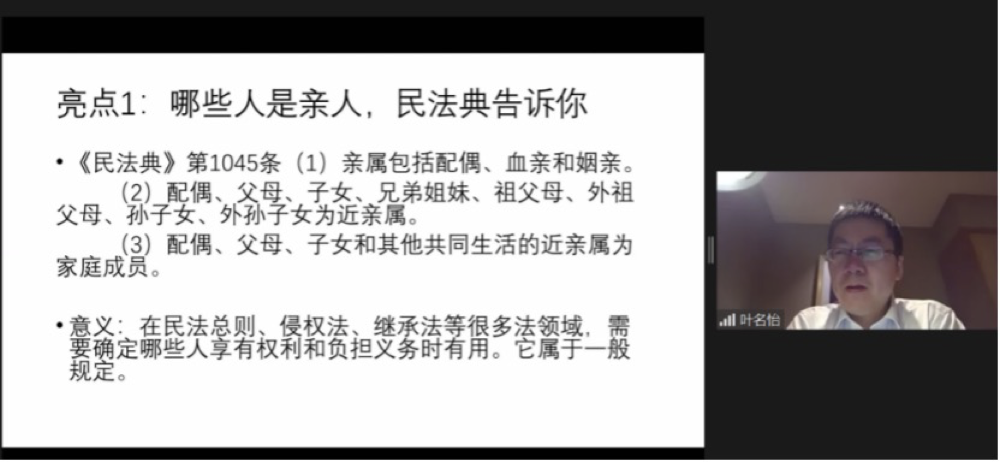 接着,叶名怡教授以“婚姻家庭编中的亮点”为主题,以实际案例为切入点,系统阐述了婚姻家庭编中一系列的制度变动。叶教授指出,婚姻家庭编中的亮点包括近亲属概念的扩大、“离婚冷静期”制度的引入、夫妻日常家事代理制度的建立、夫妻共同债务规则的更新、侄甥代位继承制度的建立、遗产处理程序与遗赠抚养协议制度的完善等,这些变化都体现了婚姻家庭编与时俱进的精神,但具体制度的运行效果如何,还有待实践检验。