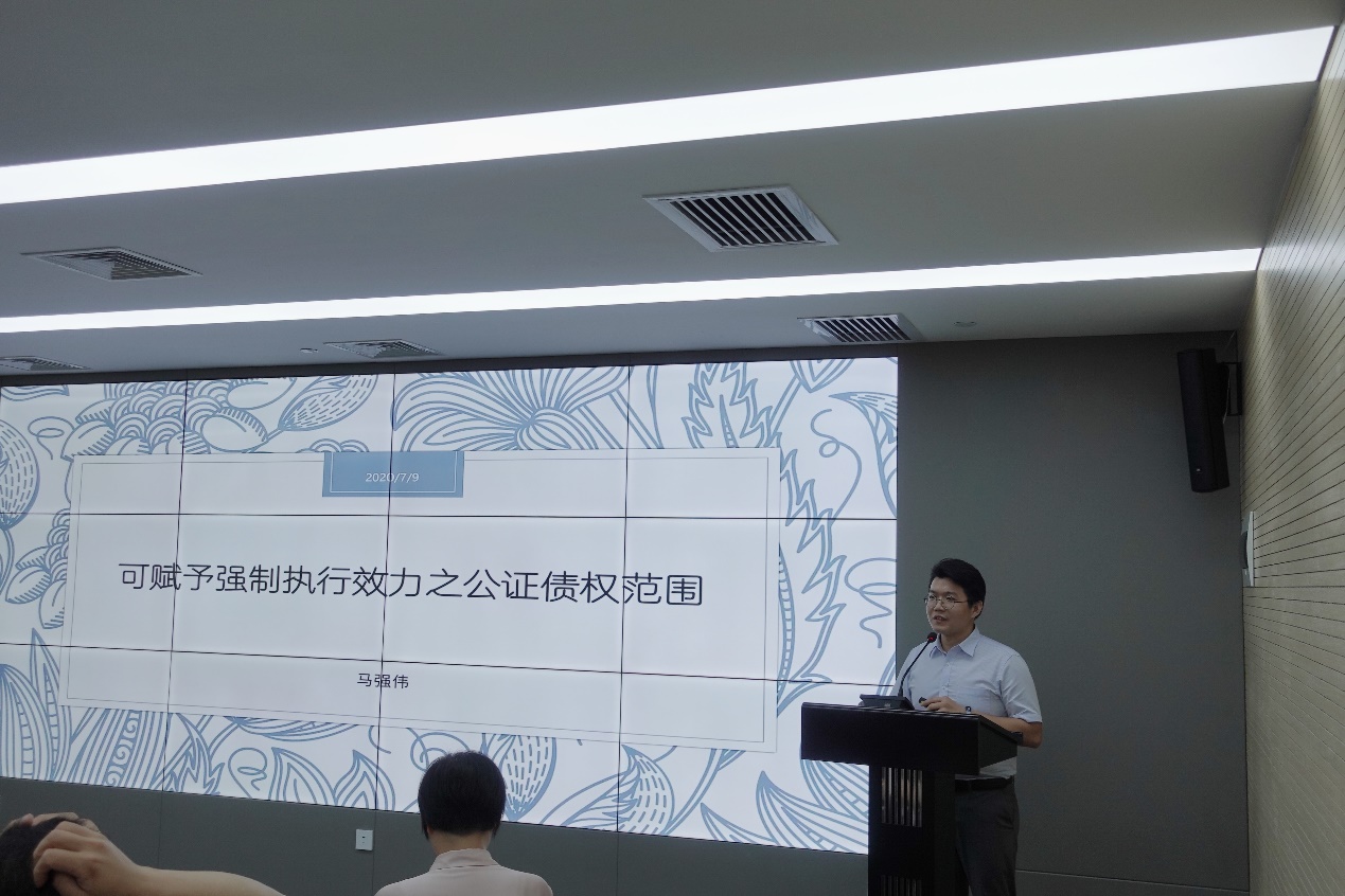 第三单元由王月主持,马强伟老师做《可赋予强制执行效力的公证债权范围》主题报告。马老师首先介绍了我国公证法、民事诉讼法及司法解释对可赋予强制执行效力的公证债权的相关条文规定,并逐一分析构成要件。随后通过比较法的研究方法,联系台湾地区和德国的立法,着重阐述符合条件的债权对给付内容的限制。马老师指出双务合同、非金钱给付做执行公证的可能性,从理论层面给公证处提供了业务拓展的潜在视角,也引发了与会嘉宾的思考。