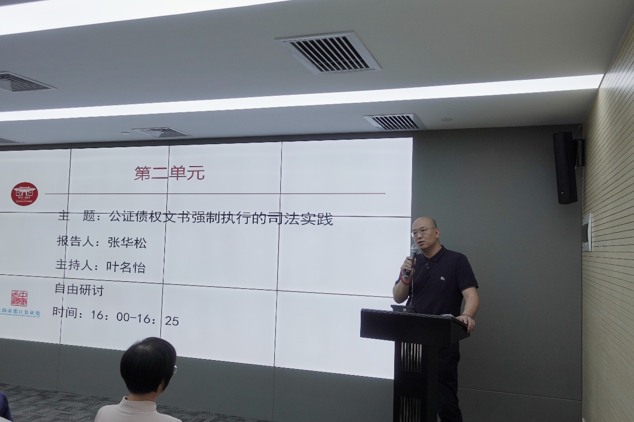 第二单元由叶名怡教授主持,张华松法官做《公证债权文书强制执行的司法实践》主题报告。张法官首先对一中院近年来受理公证强制执行案件的情况做了简单介绍,明确了执行依据是《具有强制执行效力的债权文书公证书》,但仍然需要配合公证处出具的《执行证书》,才能更加顺利推进强制执行。张法官选取了四份有代表性的公证文书,指出其中存在的问题和不足,并据此提出对公证处出具执行证书内容和要求的期望。