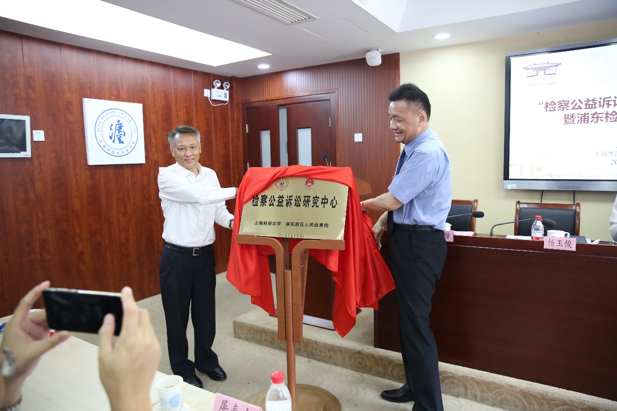 成立仪式首先由浦东新区人民检察院党组书记、检察长杨玉俊和上海财经大学党委副书记、纪委书记陈宏分别介绍了“检察公益诉讼研究中心”的成立情况,并说明了检校双方为成立研究中心所做的各项工作。随后杨玉俊检察长与陈宏书记共同为研究中心揭牌,宣告“检察公益诉讼研究中心”正式成立。