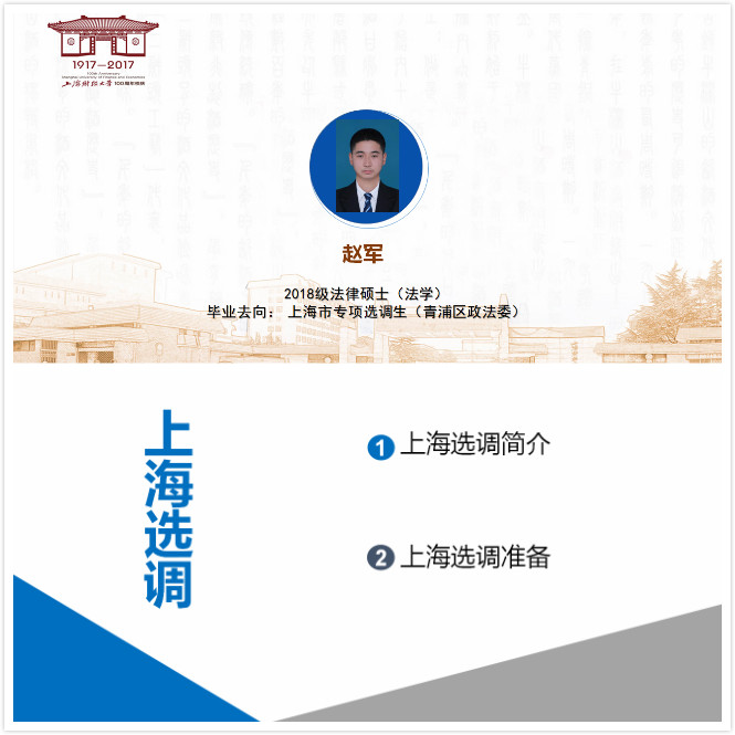 最后一位嘉宾是赵军学长,他分享的是选调生招录的相关经验,主要从专项选调、定向选调、集中选调以及选调准备四个方面进行介绍。首先赵学长区分了常见的三种选调制度,详细介绍了三种选调的概况,包括选调高校、选调条件、招录人数、选调职位、时间安排、笔试情况、招录情况和招录流程等。接着学长着重向同学们分享了选调考试应该如何准备。在笔试准备方面,学长推荐了相关的考试用书和讲授较好的网课视频,给同学们节省了自行摸索的时间。此外,学长还推荐同学们关注学校的就业中心官网以及上海选调生、上海中公选调生等公众号,以便于收集和整合相关信息。