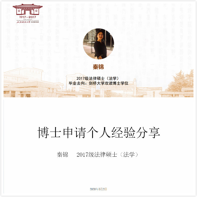 第二位嘉宾是秦锦学姐。秦锦学姐成功申请了剑桥大学的博士,因此在这次活动中她为我们介绍的是申请海外博士的相关经验。秦学姐的分享主要从读博理由、申请要求、申请材料、如何申请以及注意事项几方面进行。在理由方面,秦学姐提醒大家要有自己的主见,坚持自己为何如此选择的初心,并在决定之前多方搜集相关信息。随后学姐对申请海外读博的要求、材料及具体流程进行了详细的介绍,对各流程中具体操作细节也进行了详细的阐述。最后学姐强调了一些申请过程中的注意事项,给同学们介绍了一些申请海外博士的小技巧。相信秦学姐的海外博士申请经验分享给有留学意愿的同学带来了很大的收获。