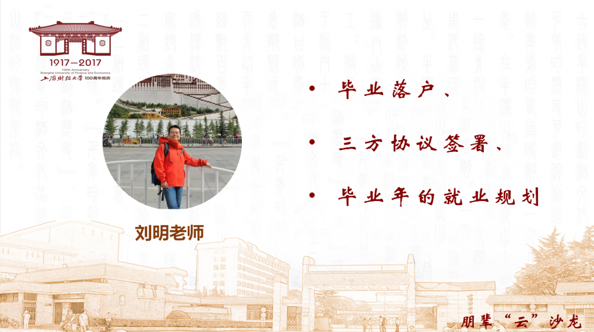 在五位学长学姐经验分享结束后,刘明老师对毕业落户、三方协议签署和毕业年就业规划三个方面的问题进行了详细的解释和答疑,并着重强调了开题答辩、法考、银行招聘、毕业登记表、简历制作、论文撰写、公务员考试等事项。此外,刘老师还对毕业班同学在各个阶段的重要事项作出了全面的说明,旨在提示毕业班同学妥善安排好时间,完善毕业事宜。