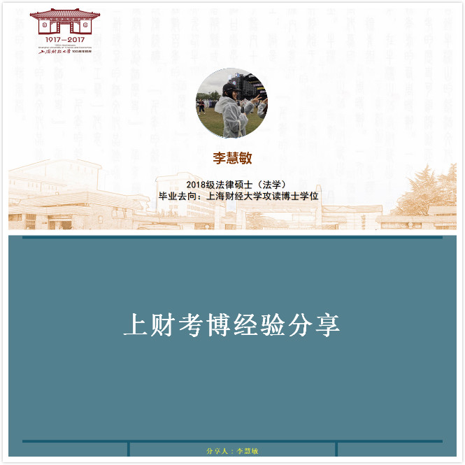 第三位进行分享的嘉宾是李慧敏学姐。李学姐目前在本校读博,因此她为我们分享的是国内博士申请的相关事宜。李学姐主要从读博的理由、考博的准备以及推荐审核制的流程三个方面展开。关于读博的理由,学姐强调个人兴趣和未来的职业规划是十分重要的。在考博准备方面,学姐介绍了如何选择学校和导师、需要哪些知识储备以及面对压力如何处理这三个方面的相关内容,并区分了统一招生和推荐审核制两种考核方式。在介绍推荐审核制的流程时,学姐指出应关注招生简章等官方信息,并给出了许多关于面试笔试的建议。令人印象深刻的是学姐面对压力时所保持的坚定、坚持和坚信态度,不管是求职还是升学备考,都值得我们学习。
