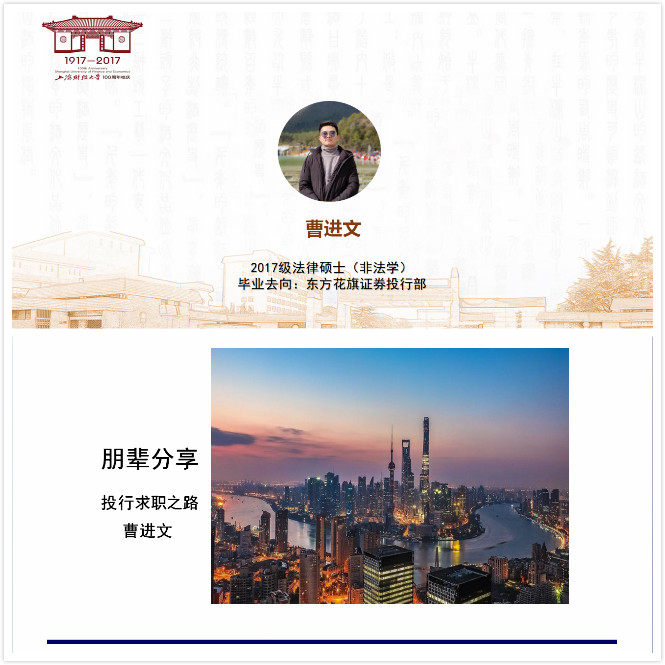 首先是留用东方花旗投资银行部的曹进文学长进行分享,本次分享会他给我们介绍的是投行求职情况。曹学长从为什么选择投行以及投行留用过程两个方面进行了详细的阐述。在选择投行的理由上,学长分析了投行工作的短期回报和长期发展,展现了投行良好的工作待遇和可观的发展前景,但同时也指出了其缺点,即出差密集和工作强度高。在第二部分,学长从留用流程、进入投行具备的素质与暑假情报三方面进行介绍。其中的暑假实习情报是由学长自己的实习经验精心总结而来,同学们受益匪浅。而除了求职经验之外,曹学长在最后提到了求职心态的重要性。其指出工作没有好坏之分,只有适合不适合自己之分,作为求职者,我们应摆正心态,弄清楚自己想要的是什么。
