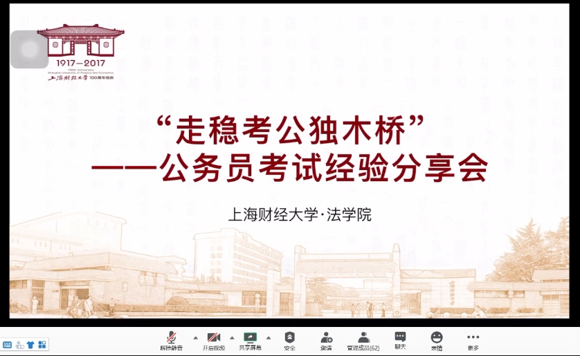 2020年6月20日晚,由beplay全站研究生会主办的“走稳考公独木桥”——公务员考试经验分享成功举办。本次分享会有幸邀请到了成功考取上海专项选调生的赵军学长,同时还非常荣幸地请到我们的辅导员刘明老师作为嘉宾。他们以云端沙龙的形式与有意愿考取公务员的同学进行线上经验分享和指导,活动吸引了近百位同学前来聆听,会议现场气氛十分活跃。