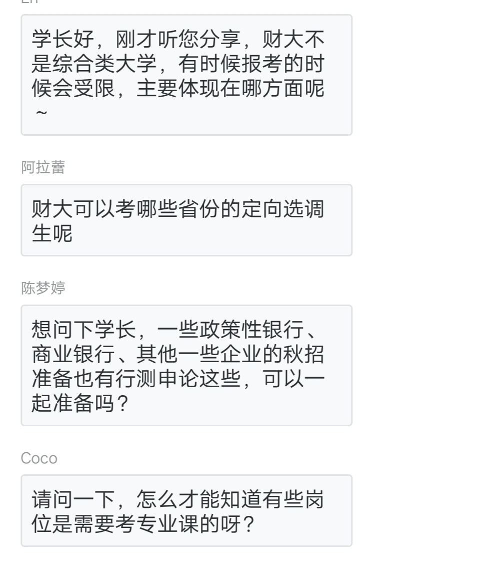 紧接着是同学们的问答环节。虽然是线上分享,但是同学们都热情高涨,就“考公”相关问题积极向学长提问,讨论区一片火热。问题涉及方方面面,如财大学生可以考哪些省份的定向选调、哪些公务员岗位需要考专业课、对政策性银行、商业银行行测申论和考公是否重合、选调和秋招时间是否冲突,如何协调等。学长就每个同学的问题都耐心解答,答疑环节持续了半个多小时,同学们的疑惑都得到了答案,收获颇多。