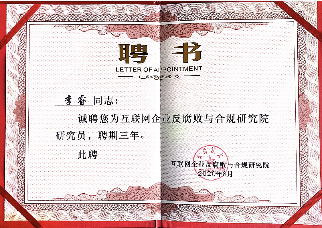 同时,李睿老师被聘为“互联网企业反腐败与合规研究院研究员”将持续致力于相关领域的研究工作。