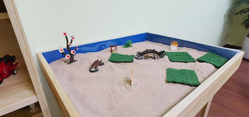 心理疗愈室一角摆放着一个沙盘