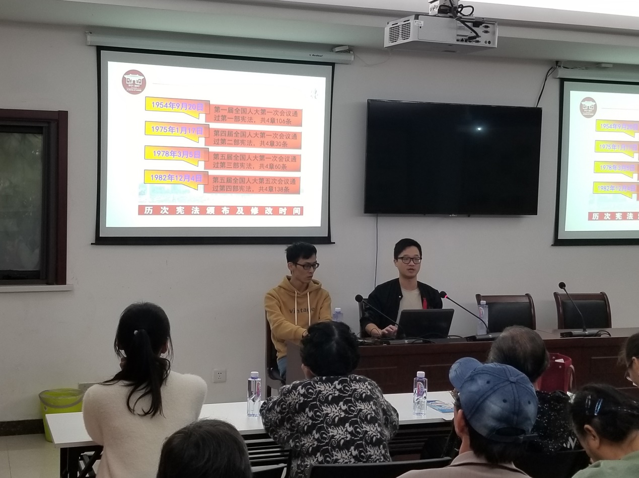 主讲人郑丰耀简单介绍了活动背景与小组成员之后,正式进入到了主题。首先,郑丰耀从宪法的内沿和外延出发,具体阐释了宪法这一概念的涵义,通过比较宪法与民法、宪法与刑法、宪法与行政法以及宪法与规范性法律文件的关系,解释了宪法在我国的根本大法地位,并且通过幽默风趣的语言讲解了宪法之所以为根本大法的原因;其次,郑丰耀接着展开讲述宪法中人权保障的具体内容,主要包括受教育权和财产权两个方面。在受教育权方面,郑丰耀结合宪法条文和我国的九年义务教育以及其他教育政策,将宪法条文分解在具体的制度之中,使大家对于宪法条文有更深刻的理解,在财产权方面,郑同学结合大家都很关心的房屋问题,为大家讲解了私有财产、公有财产以及集体财产的区别,并且现场解答了一位居民关于小产权房和商品房区别的问题;在郑丰耀讲解内容的基础上,张海东接着为大家讲解宪法中的人权保障具体内容中的平等权和人身自由。张海东发挥自己略通上海话以及熟悉历史的优势,用上海话的语言形式以及将个人命运与国家命运相结合的叙事方式,讲述了我国宪法自1954年以来对于人身自由和平等权的保护,语言生动幽默,叙事方式生动形象,在讲故事的同学普及了宪法知识,现场的居民频频点头。最后,郑丰耀同学对本次普法PPT展示分进行收尾总结,展示部分结束,进入到现场答疑环节。