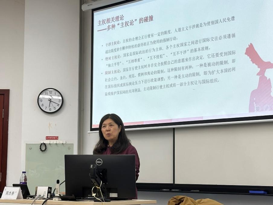 在国际争端解决部分,周老师以俄乌冲突、巴以冲突为例,阐述国际争端解决的发展历程、基本原则和主要方法,强调只有在遵守以联合国宪章为核心的国际法的基础上,以和平的方式解决国际争端才是人类社会的共同追求。