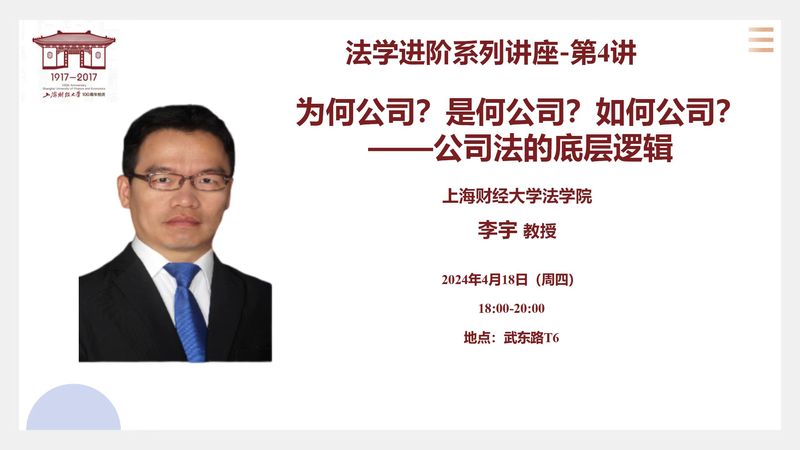 讲座预告|法学进阶系列讲座第4讲:为何公司?是何公司?如何公司?——公司法的底层逻辑
