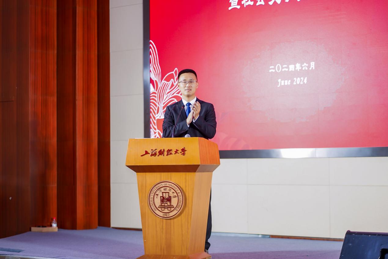 颁奖环节后,法学院2024届毕业生代表韩朋远发言。韩朋远首先代表全体毕业生向学院老师们表达了感谢,从积累知识、培养思维,到坚守信仰、保持独立,老师们的支持帮助是全面且坚实的。接着,韩朋远也对捐赠人和设奖单位的支持、陪伴与激励表达了感谢,表示自己会继续前进、迈向卓越,也表达了自己在法学之路发挥所长、肩负责任、不畏艰难、坚定前行的决心,希望自己能够永存温暖,持续为社会贡献力量。
