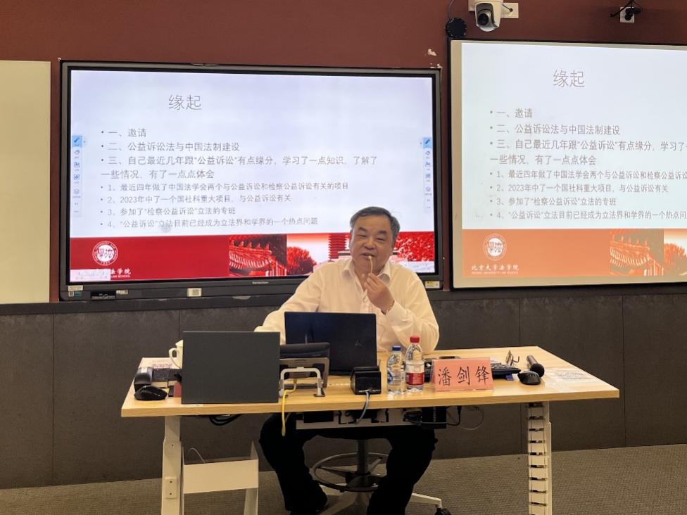 在讲座环节,潘剑锋教授以公益诉讼法的立法背景以及自身课题研究经历切入,指明公益诉讼立法问题的重要性及研究的必要性。他具体从公益诉讼与三大诉讼之间的关系、公益诉讼法立法的正当性分析、《公益诉讼法》的属性地位、《公益诉讼法》的基本原则、公益诉讼的受案范围以及检察院的地位与调查权等六个部分对公益诉讼立法的关键问题进行了分析。