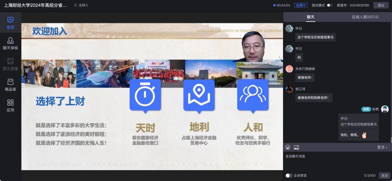 6月25日下午,郝振江老师和常彬同学通过全国普通高校招生咨询指导平台,以在线直播的方式向考生和家长介绍了上海财经大学在豫招生政策、招生计划、专业特色、就业背景以及往年录取情况等。直播期间最高8370人同时在线,观看次数达1.7万,点赞人数近1万。6月26日下午,二人赴开封高中进行招生宣讲活动。在活动现场,积极分发招生简章,详尽解答咨询疑问,助力考生精准填报志愿。考生和家长热情高涨,现场互动热烈。 27日上午,常彬同学前往河南淮阳中学进行招生宣传咨询活动。
