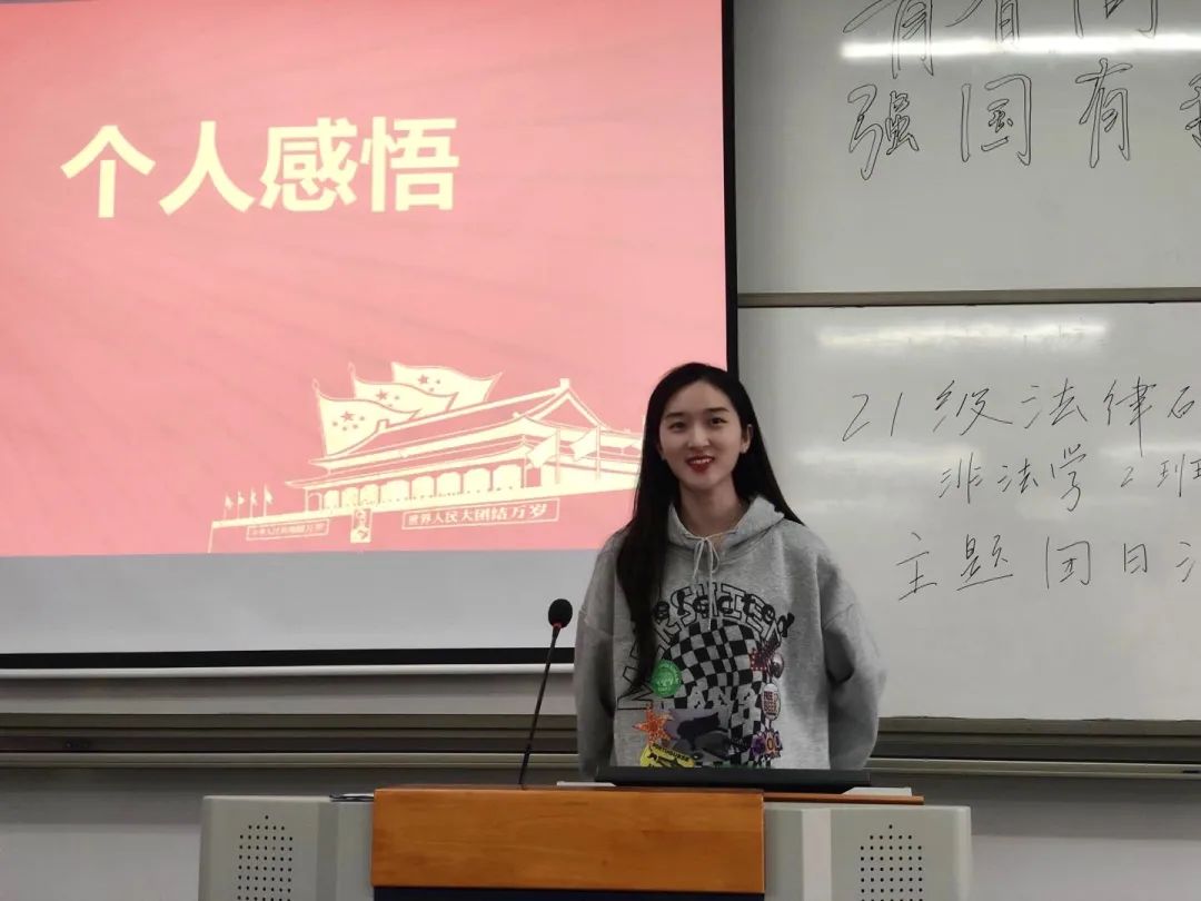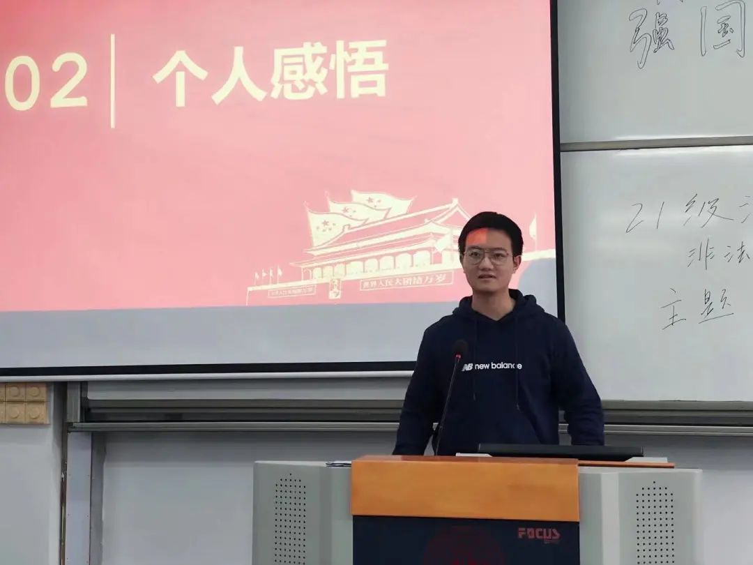 其中班长周紫薇同学讲道:“非常荣幸能够成为21级法硕非法学2班团支部的一员,今天是大家开学以来的第二次集体活动,大家齐聚一堂,团支书周子琳同学带领大家共同学习习近平总书记“七一”重要讲话精神,学生党员翁成立同学和卓佳琪同学也带领大家学习了党史,激发了大家对学习党史的兴趣,学习结束大家也纷纷发表了对这次党史学习的感悟。