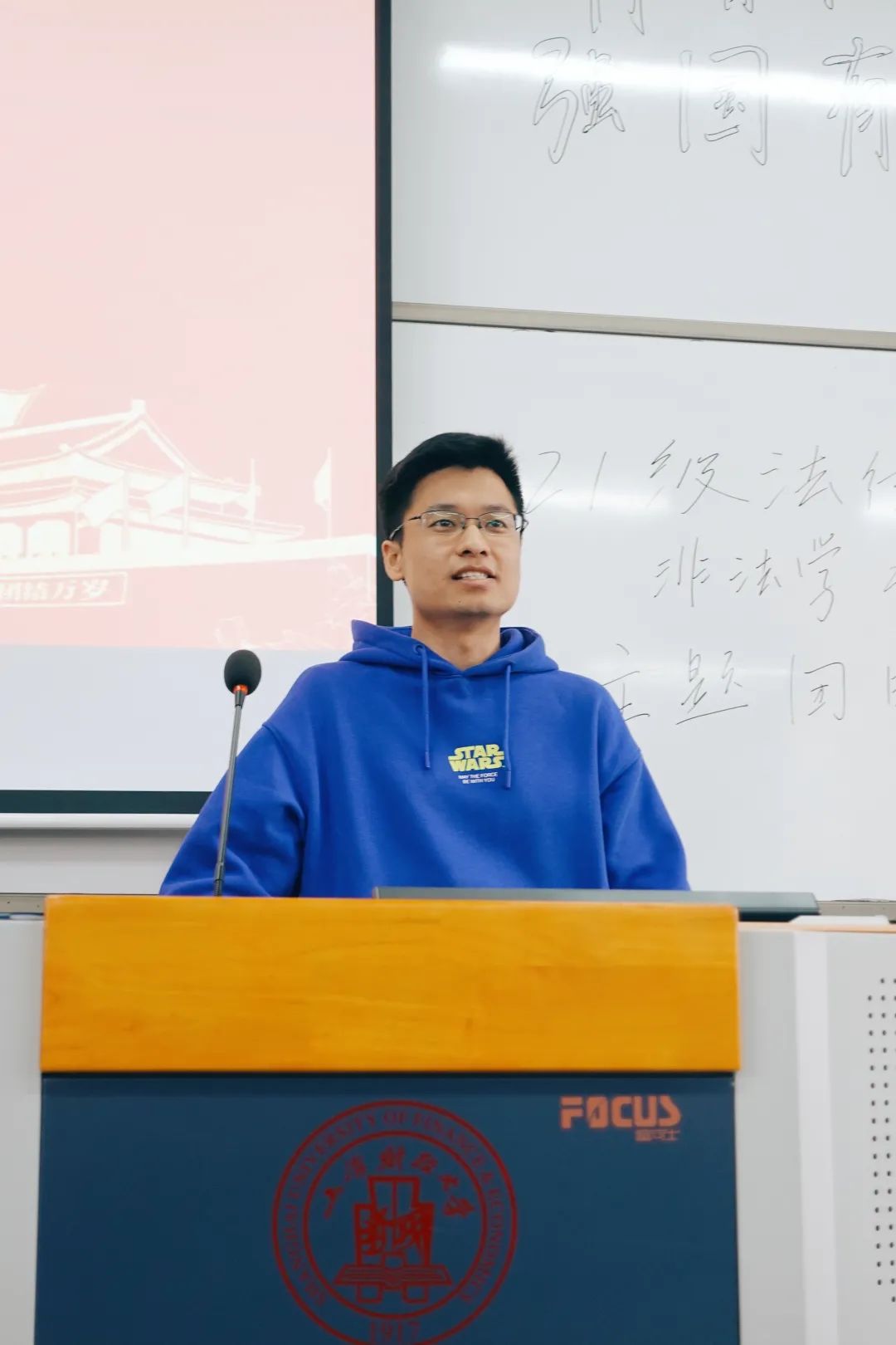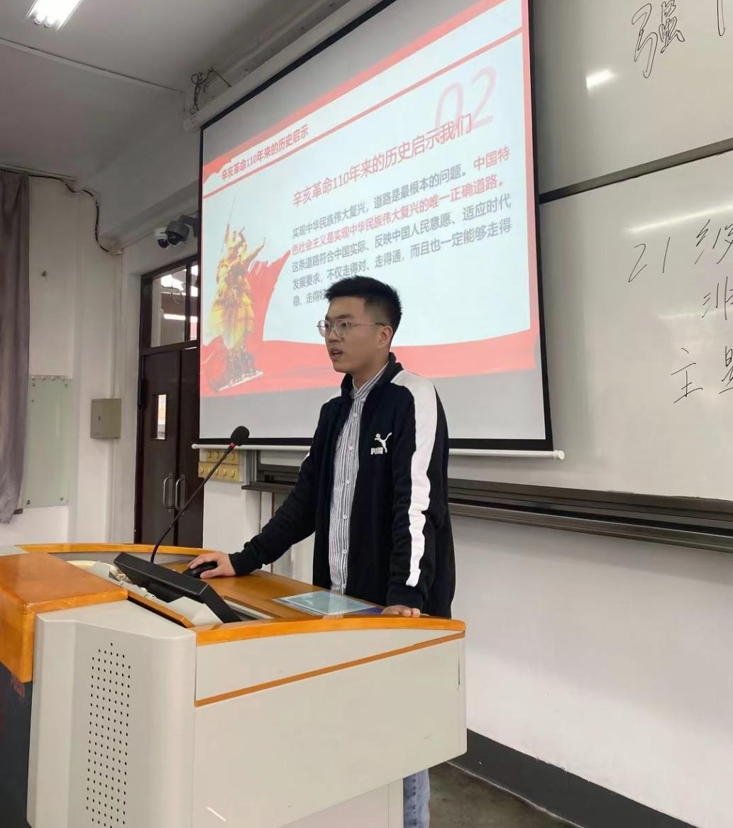 紧接着翁成立同学为全体同学讲授专题党课——《深入学习贯彻习近平总书记在纪念辛亥革命110周年大会上的讲话》。