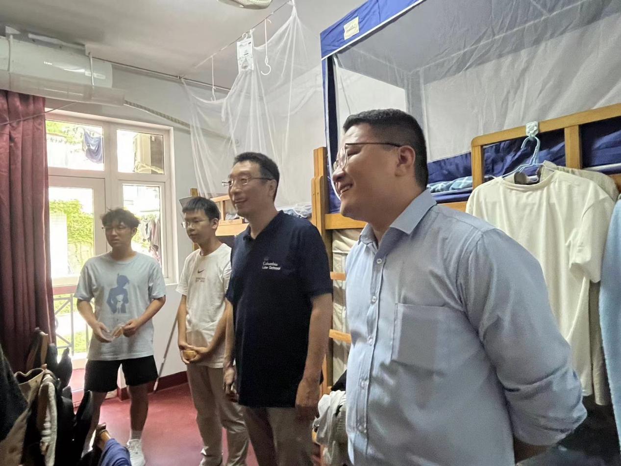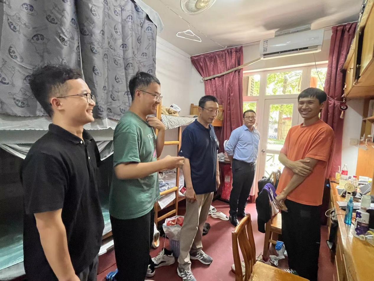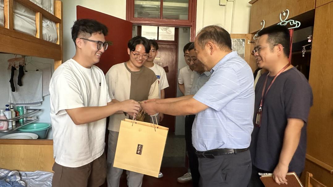 随后,朱老师一行又到21号男生宿舍楼,每到一处,老师们不仅送上节日的问候,还仔细询问了同学们的生活适应情况以及遇到的问题,鼓励他们积极融入集体生活,珍惜大学时光。学生们纷纷表示感受到了家一般的温暖,对即将到来的大学生活充满了期待。
