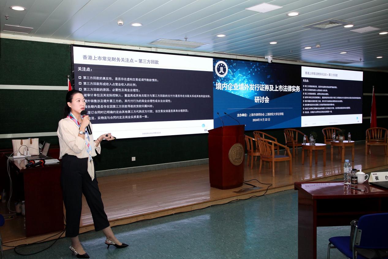 随后,来自安永华明会计师事务所的吴慧珺女士发表了题为“企业赴港上市之财务关注点”的主题演讲,其分享介绍了会计师在企业赴港上市过程中的主要工作,并就香港上市常见财务关注点展开充分介绍,如赴港上市企业财务报告中出现的可转换可赎回优先股、区分股与债的必要性、第三方回款的常见情形等。