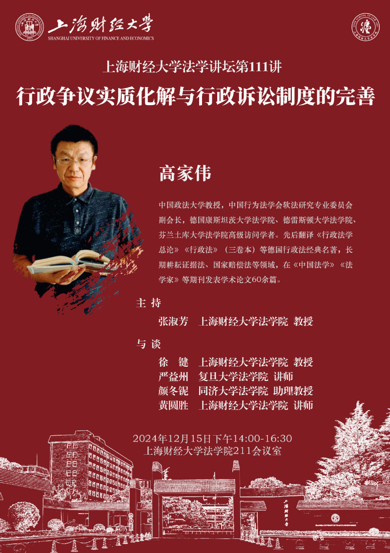 讲座预告 | 上海财经大学法学讲坛第111讲 行政争议实质化解与行政诉讼制度的完善
