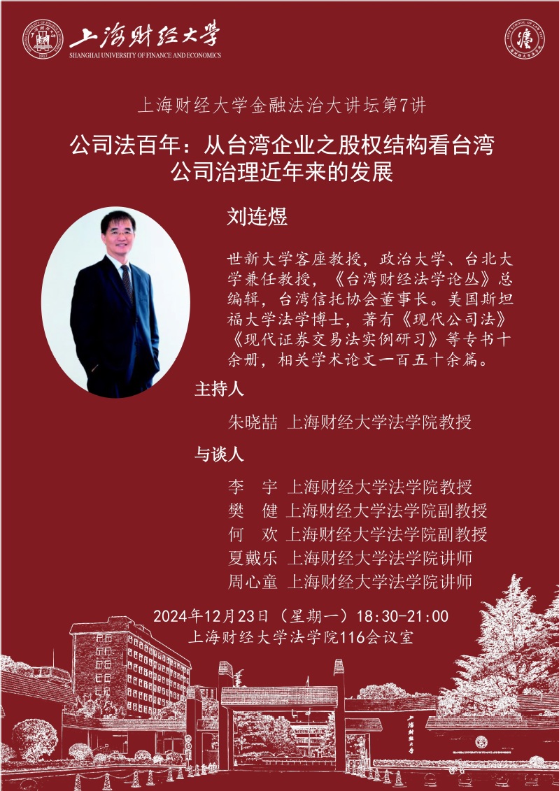 讲座预告 | 上海财经大学金融法治大讲坛第7讲:公司法百年:从台湾企业之股权结构看台湾公司治理近年来的发展