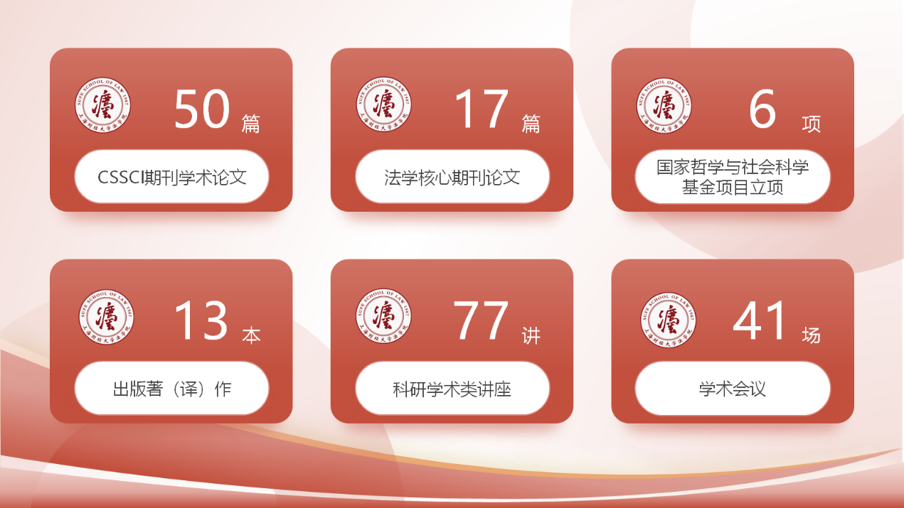 2024年度,法学院科研人员发表在CSSCI期刊上学术论文共计50篇。其中法学核心期刊上发表论文17篇。在《法学研究》《中国法学》权威期刊上共发表论文2篇;共获得国家哲学与社会科学基金项目立项6项,其中一项重点项目;在北京大学出版社、法律出版社、上海财经大学出版社出版著(译)著13本;共开设科研学术类讲座共77讲,共举办学术会议41场,其中国际会议5场。