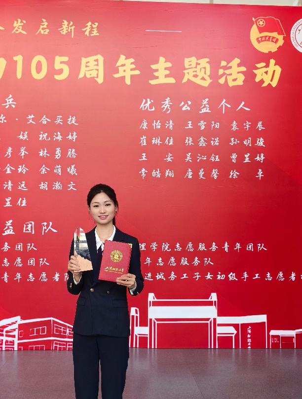 从志愿活动的参与者到组织者,她认为每一个志愿服务活动都是一个锻炼实践能力、提升综合素养机会,也能在其中遇见更多挑战、收获更多成长。在未来的工作岗位上,她依然会牢记奉献、友爱、互助、进步的精神,保持志愿者的热忱。