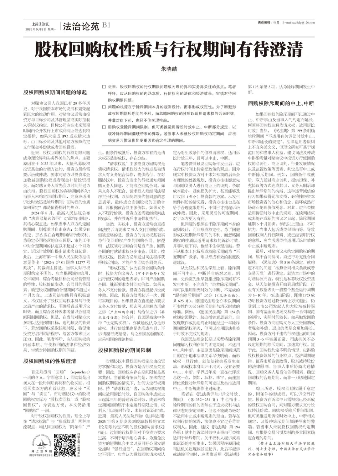 近来,股权回购权的行权期限问题成为理论界和实务界关注的焦点。主要原因在于2022年以来,大量私募股权投资基金的对赌方违约,投资方最终需要诉讼或仲裁,要求对赌方以投资本金加收益回购股权或者现金补偿投资损失。而对赌义务人首先会以时间经过为由抗辩。股权回购权的存续期间多久?当事人未约定回购权期间,究竟应适用诉讼时效还是除斥期间?回购权的性质如何界定?都是值得探讨的焦点。
