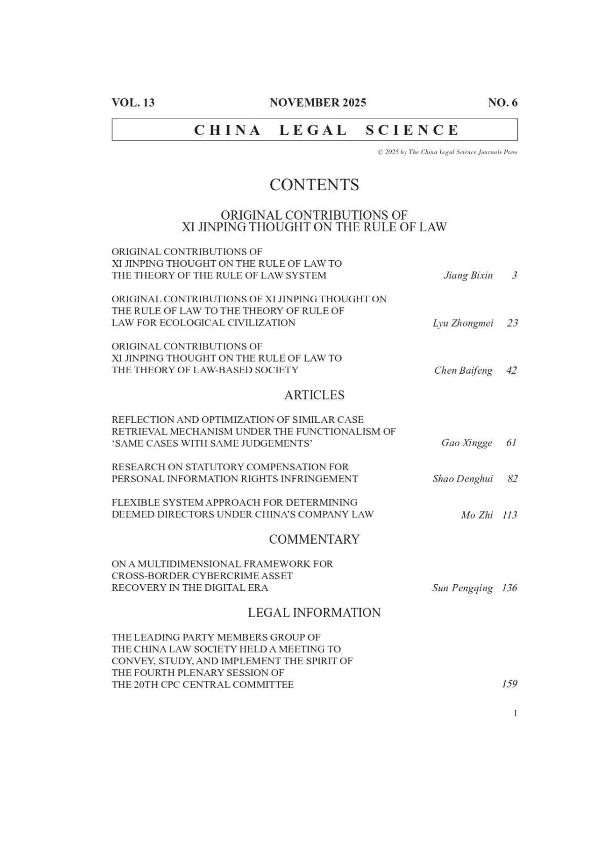 China Legal Science是由中央政法委主管、中国法学会主办、中国法学杂志社出版的英文法学学术期刊(双月刊),于2013年正式创刊。杂志以反映中国特色社会主义法学理论和实践成果,展示我国法治建设成就,推动国际学术交流,提升中国特色社会主义法学理论体系的国际影响力以及塑造“法治中国”形象为宗旨,目前设有“学术专论”“法律评论”“案例研究”以及“法学资讯”等栏目。自出版发行以来,China Legal Science受到了国际学术界的广泛关注,现已与Heinonline、中国知网、国家哲学社会科学学术期刊数据库、北大法宝等国际国内知名数据库等多家国内外法学法律数据库和诸多文摘期刊建立了紧密的合作关系,杂志影响力逐年稳步提升。根据中国知网发布的《中国英文学术期刊国际国内引证报告(2023)》统计数据显示,China Legal Science在法学类英文学术期刊中排名第一;根据中国社会科学评价研究院于2023年1月发布的《中国人文社会科学期刊AMI综合评价报告(2022年)》,在51种中国人文社会科学英文学术期刊中,China Legal Science是唯一一家英文法学核心期刊;2023年被正式列入CLSCI来源期刊。