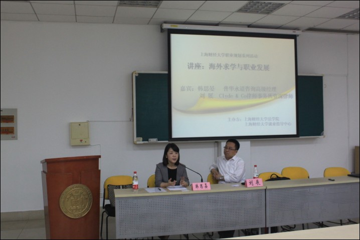 6月15日上午,法学院主办的职业规划讲座——《海外求学与职业发展》在校行政楼一楼阶梯教室举行。讲座的主讲嘉宾是普华永道会计师事务所咨询部高级经理韩思晏女士、Clyde&Co律师事务所资深律师刘展先生。讲座由法学院团委书记王蕴老师主持。