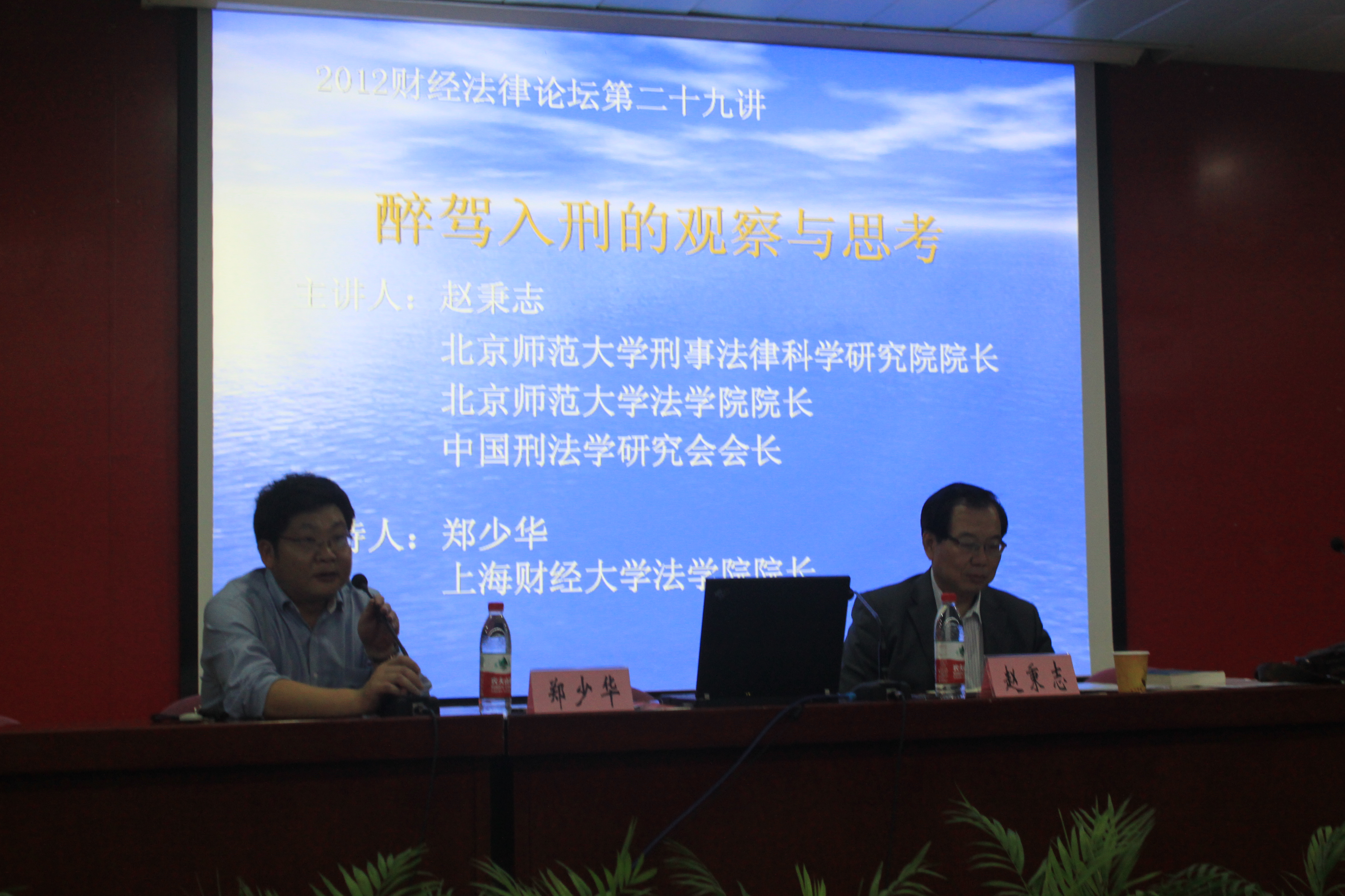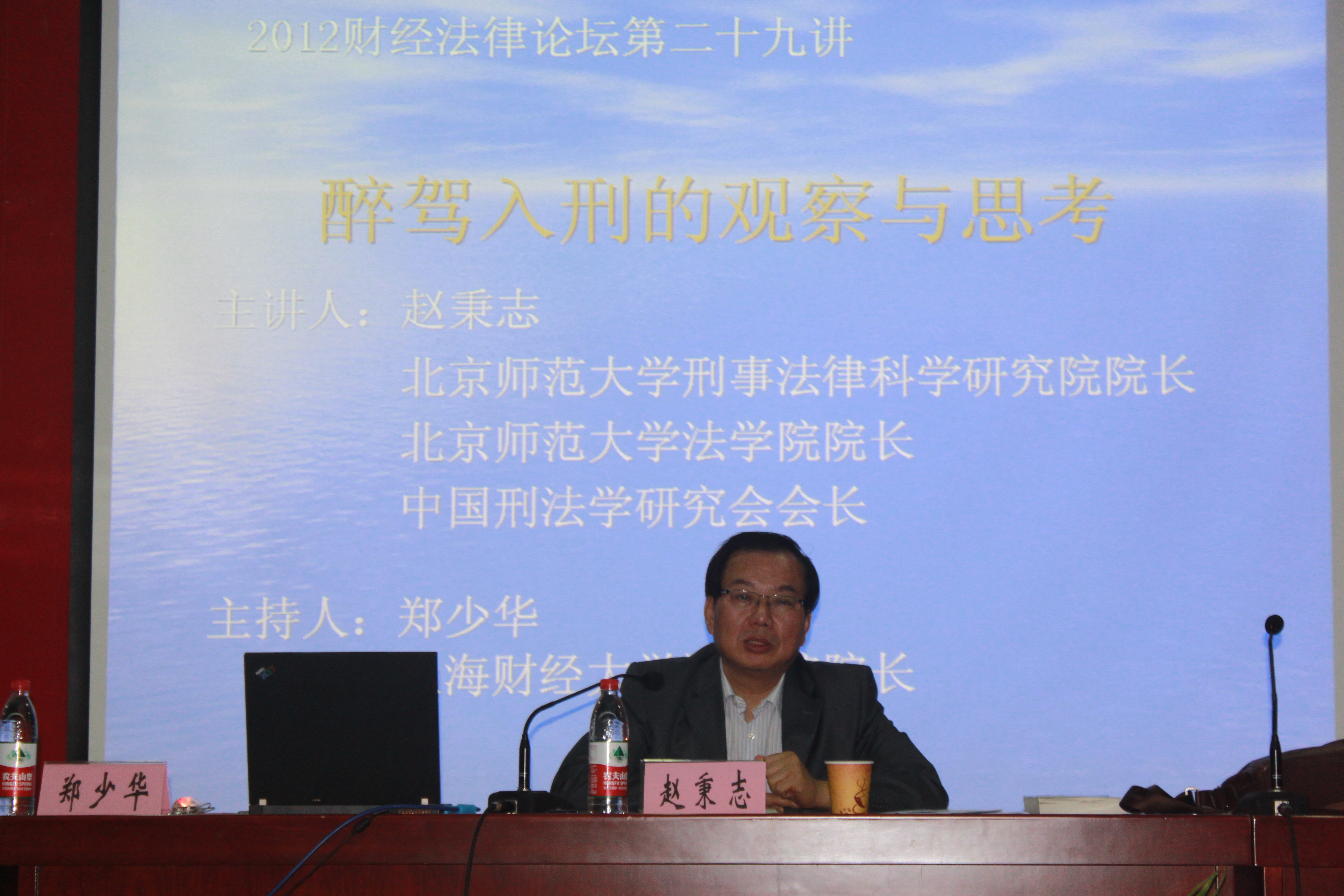 9月19日晚,2012财经法律论坛第二十九讲在行政楼一楼报告厅成功举行。北京师范大学刑事法律科学研究院院长、北京师范大学法学院院长、中国刑法学研究会会长赵秉志教授做了题为“醉驾入刑的观察与思考”的讲座。本次讲座由郑少华院长主持。法学院赵维加老师、麻国安老师以及张开骏老师亦出席了讲座。