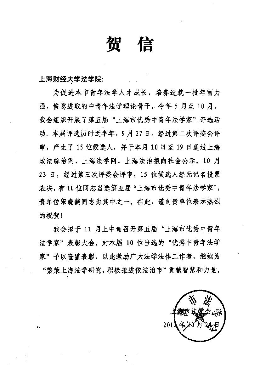 近日,接上海市法学会贺信,我院宋晓燕教授当选第五届“上海市优秀中青年法学家”。这是我院继郑少华教授(2006)、张淑芳教授(2009)后又一教师获此荣誉称号。