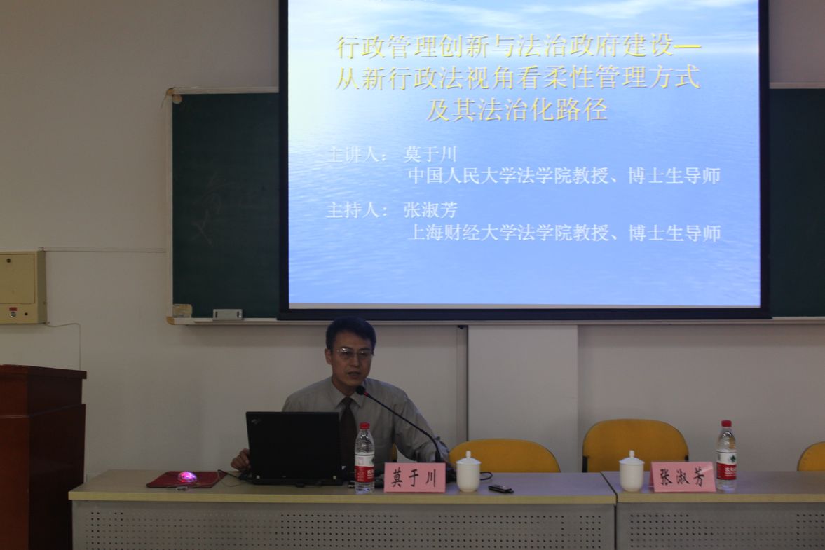 10月19日晚,2012财经法律论坛第三十四讲在行政楼一楼梯教成功举行。中国人民大学法学院博士生导师莫于川教授作了题为“行政管理创新与法治政府建设——从新行政法视角看柔性管理方式及其法制化路径”的讲座。本次讲座由beplay全站 张淑芳教授主持。王士如教授以及徐键老师也出席了讲座。