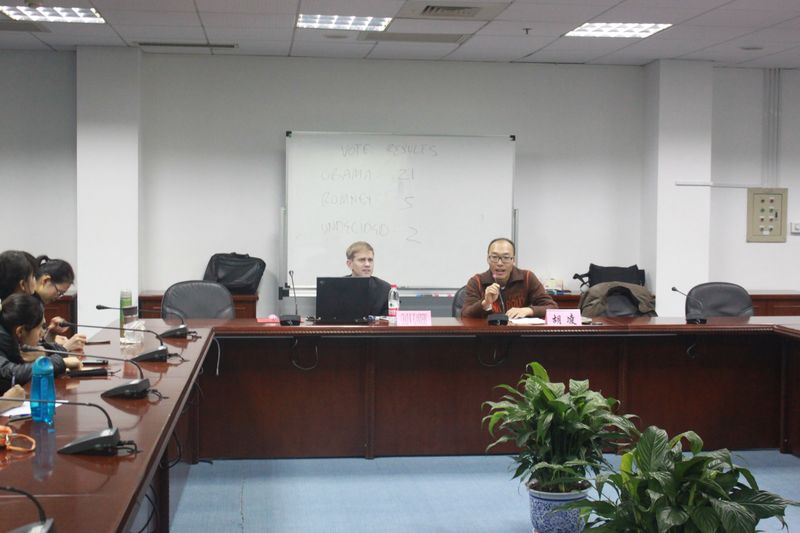 CHAD W. FLANDERS教授首先现场做了一个调查,对于美国总统选举,分别从作为美国人和中国人的角度,在场的人会选谁?并与到场的师生进行探讨为何会得出这样的结论。接下来探讨了关于此次选举的问题:这个选举的结果是好的吗?整个过程是否公平?是否一些选举州对某个候选人有偏见而倾向于其他的候选人?FLANDERS教授向同学们讲解了关于选举的规则问题,可以称在美国关于竞选的规则为民主法,这些规则规范谁可以竞选,谁可以投票,这个过程是怎么管理的三个问题,并详细加以解释。