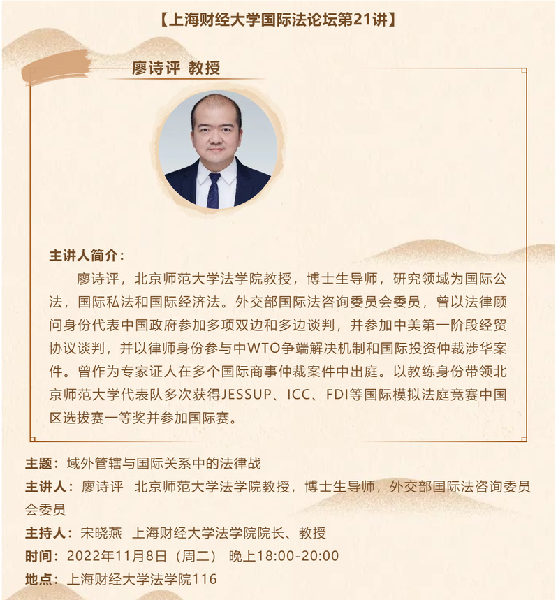 讲座预告 | 北京师范大学法学院廖诗评教授《域外管辖与国际关系中的法律战》