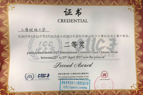学院决定参赛后,由曾带队获得上海市大学生模拟法庭竞赛冠军的上海财经大学法学院试验实践教学中心主任李睿老师作为领队组队参赛、法学院国际公法专家张军旗教授予以专业指导,出场的队员则分别是来自法学院“英美法证书班”的曹馨文、刘紫薇、钟宛霖、孙明玥以及经济法班的龚福玉。在比赛的准备阶段,法学院全力支持,邀请了相关领域的专家学者和实务律师对参赛队员进行培训和指导。在正赛中,钟宛霖、刘紫薇和曹馨文分别担任被害人代理人、辩方律师和检方律师,由孙明玥与龚福玉两位同学担任研究员,组成一支赛队代表上海财经大学赴中国人民大学参加ICC中文赛正赛。比赛于4月21日在明德法学楼报告厅开幕,次日进入正赛环节,在经过持续一整天的庭辩角逐之后,我校学子最终取得了全国二等奖的优异成绩,同获二等奖项的还分别有来自香港中文大学、清华大学、上海交通大学、外交学院等院校的赛队。