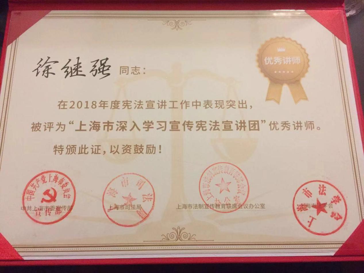 2018年4月17日,中共上海市委宣传部、上海市司法局、上海市法制宣传教育联席会议办公室、上海市法学会联合成立了上海市深入学习宣传宪法讲师团,该宣讲团由34名法学、法律专家学者组成,beplay全站 徐继强教授是宣讲团中的一员。宣讲期间,徐继强教授多次赴全市机关、企事业单位和街道、社区开展宪法宣传讲座,因其在2018年度宪法宣传工作中表现突出,被评为“上海市深入学习宣传宪法宣讲团”优秀讲师。
