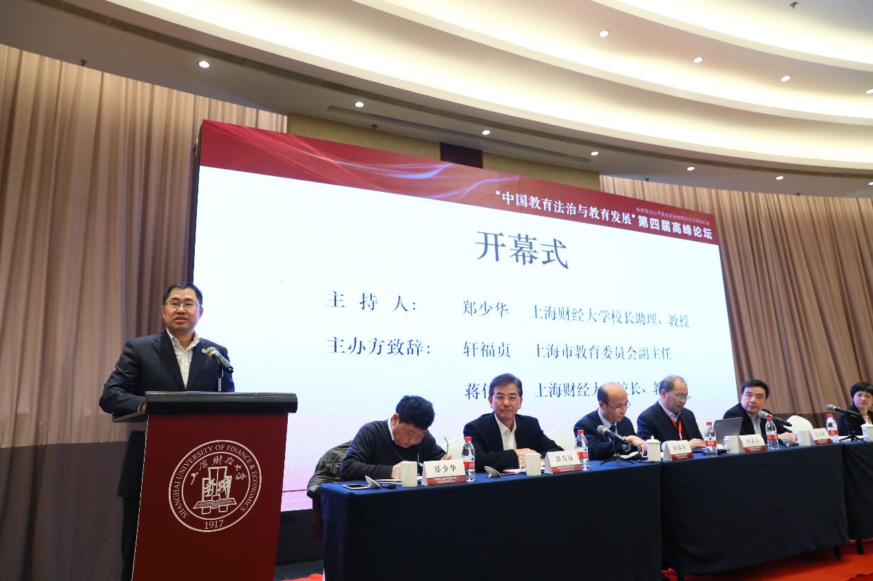 2019年11月30日,由中国教育发展战略学会发起指导,上海市教育委员会、上海财经大学联合主办,华东政法大学协办的第四届中国教育法治与教育发展高峰论坛在上海财经大学成功举行。本次论坛聚焦“构建更高公平更有质量教育的法治保障机制”“新中国七十年教育法治发展的回顾与展望”总主题,围绕“教育治理体系和治理能力现代化”“教育法学理论体系与学科建设”“教师惩戒权与依法治教”等三个专题展开研讨。来自全国各地法学、教育学等相关领域的70余名专家参加了本次论坛。中国教育发展战略学会会长孙霄兵、教育部政策法规司副司长王大泉、上海市教育委员会副主任轩福贞、上海财经大学校长蒋传海等出席会议。会议开幕式由上海财经大学校长助理郑少华主持。