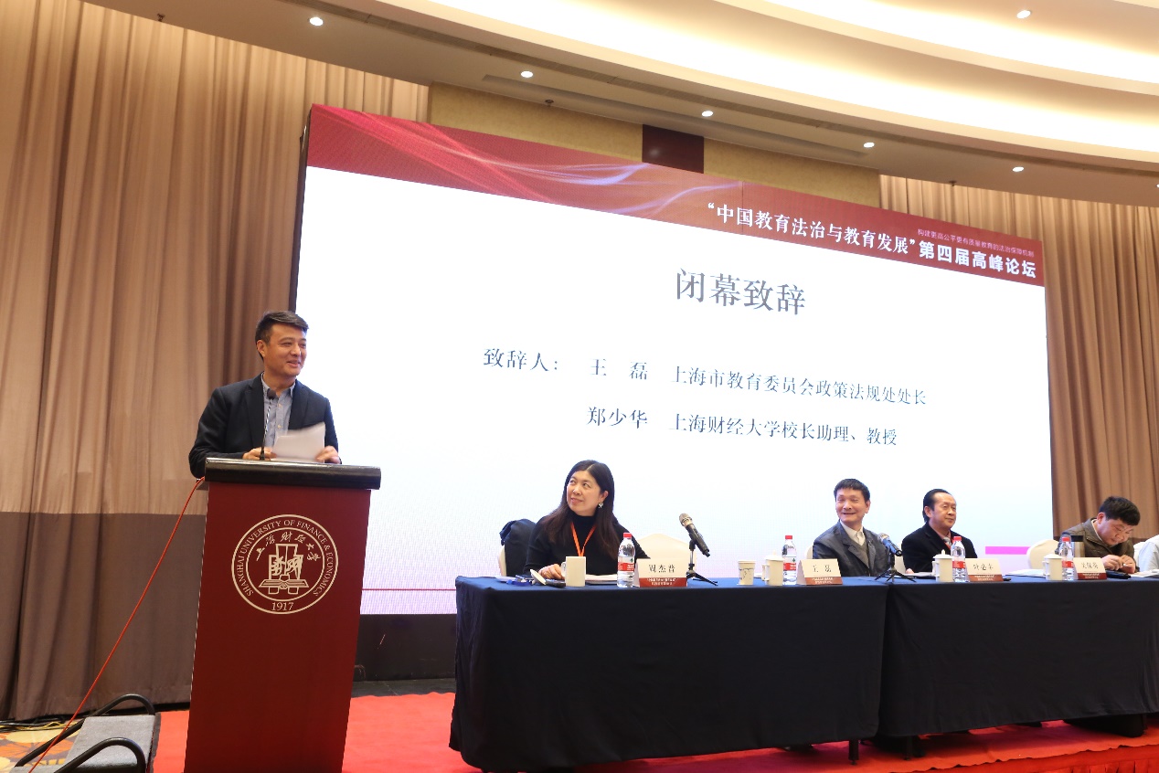 上海市教育委员会政策法规处处长王磊在闭幕致辞中高度评价了研讨会的重大意义,表示高峰论坛已经成为全国关注教育治理问题、关心教育法治事业发展的各位领导、专家、学者的一次友情盛会、学术盛筵。