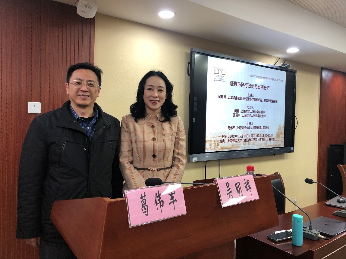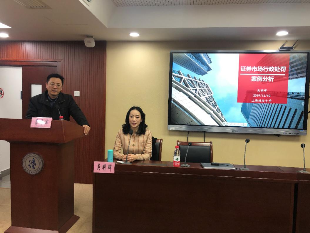 2019年12月10日晚18点,上海财经大学财经法律论坛第174讲于法学院116会议室举行。本次论坛由上海证券交易所巡回协作部副总监、行政处罚委委员吴明晖担任主讲人,讲座主题为《证券市场行政处罚案例分析》。beplay全站 副院长葛伟军教授担任主持人。beplay全站 樊健、夏戴乐老师以及众多学生参加了此次论坛。