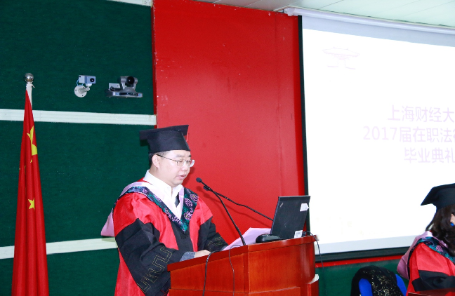 The guests attending the graduation ceremony included Professor Zheng Shaohua who is Shanghai University of Finance & Economics’ Assistant Principal and Executive Vice-president of Graduate School, Senior Judge Chen Xuebin who is also Vice-president of Guangdong Judges College, Huang Shengping who is Vice-president of Continuous Education School of Wenzhou Vocational & Technical College, Vice-professor Zhou Jiepu who is SHUFE Law’s Secretary of CPC Committee, Vice-president of SHUFE Law (in charge) Professor Song Xiaoyan, Vice-president and Vice-professor of SHUFE Law Hu Ling, Director of J.M Education Center Professor Xu Jiqiang, etc.