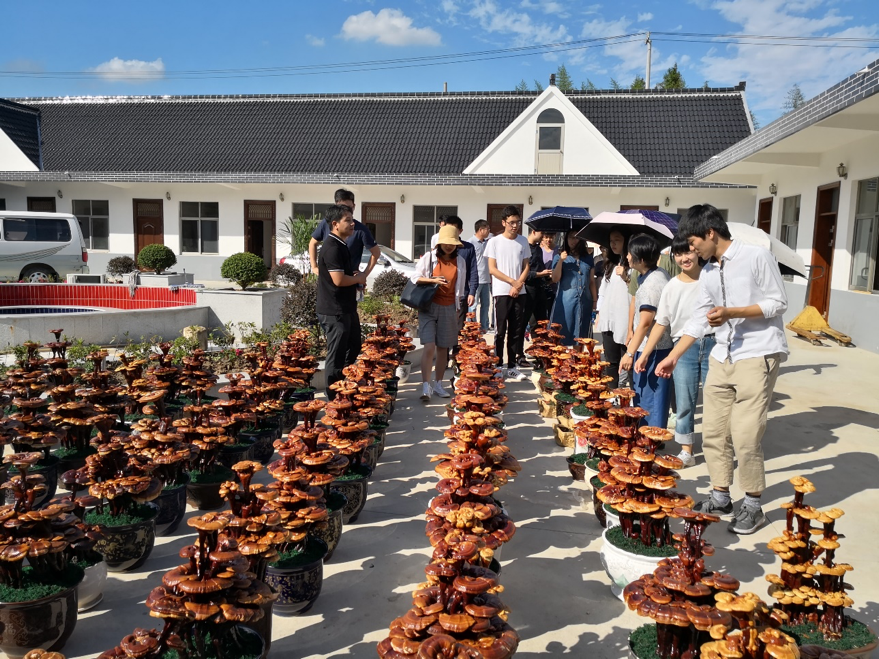 Then the students came to the Jialing Cooperative near this elementary school. The courtyard is filled with exquisite crafts made with Ganoderma lucidum. The cooperative uses the greenhouse to grow Ganoderma lucidum, and after the ripening of Ganoderma lucidum, it is processed into a fine handicraft. The final products include potted plants, cranes, dragonflies, peacocks, etc., in a variety of ways. The students also went to the greenhouse to observe the living environment of Ganoderma lucidum.